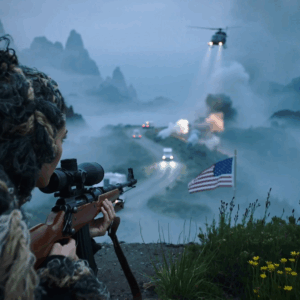 A quiet alert came: “Enemies, 3,000 meters out—then she surfaced through the mist, sniper gear ready